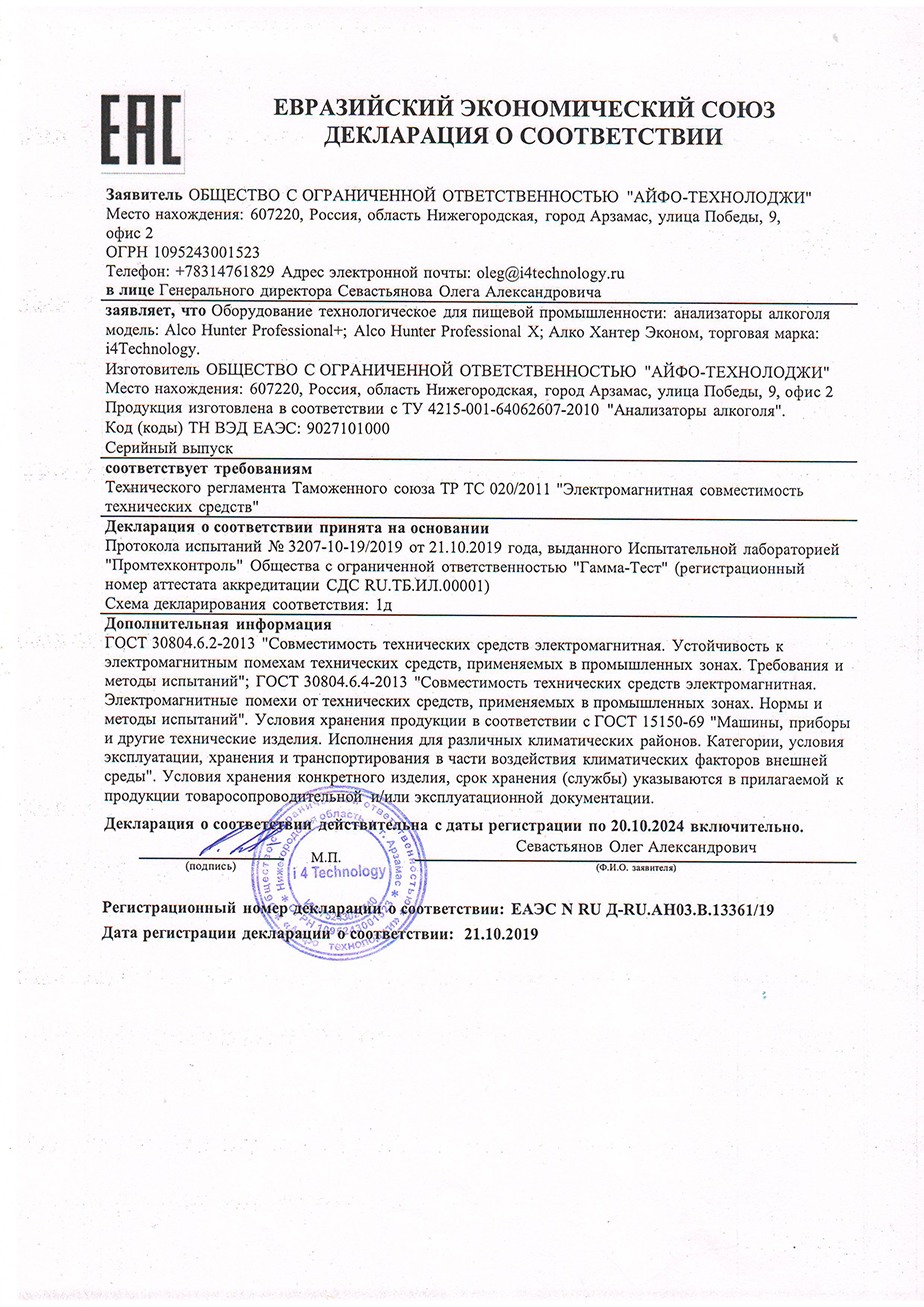 Алкотестер "AlcoHunter Эконом" был разработан и производится сотрудниками компании "i4Technology". Высокое качество продукции гарантируется применением комплексной пятиступенчатой системой контроля качества, применяемой при производстве. Такой контроль также обеспечивает строгое соответствие заявленным производителем техническим характеристикам.