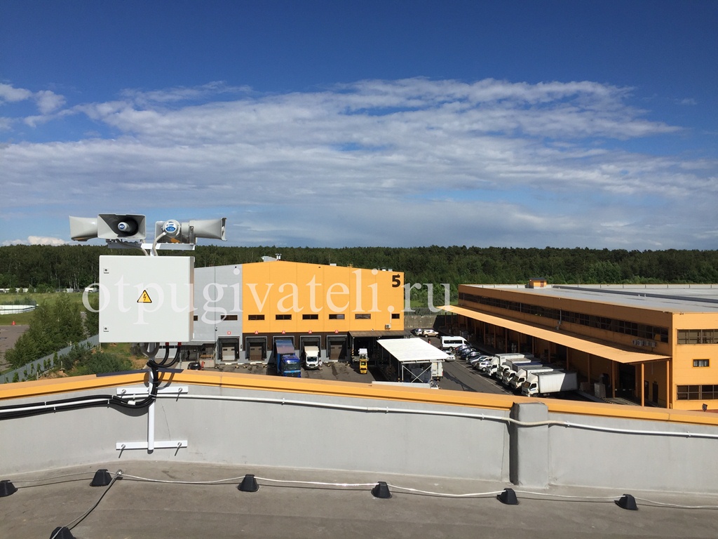 Стационарный биоакустический отпугиватель "Биозвук МС" защищает крышу логистического комплекса от чаек и ворон в Нахабино (Московская область)