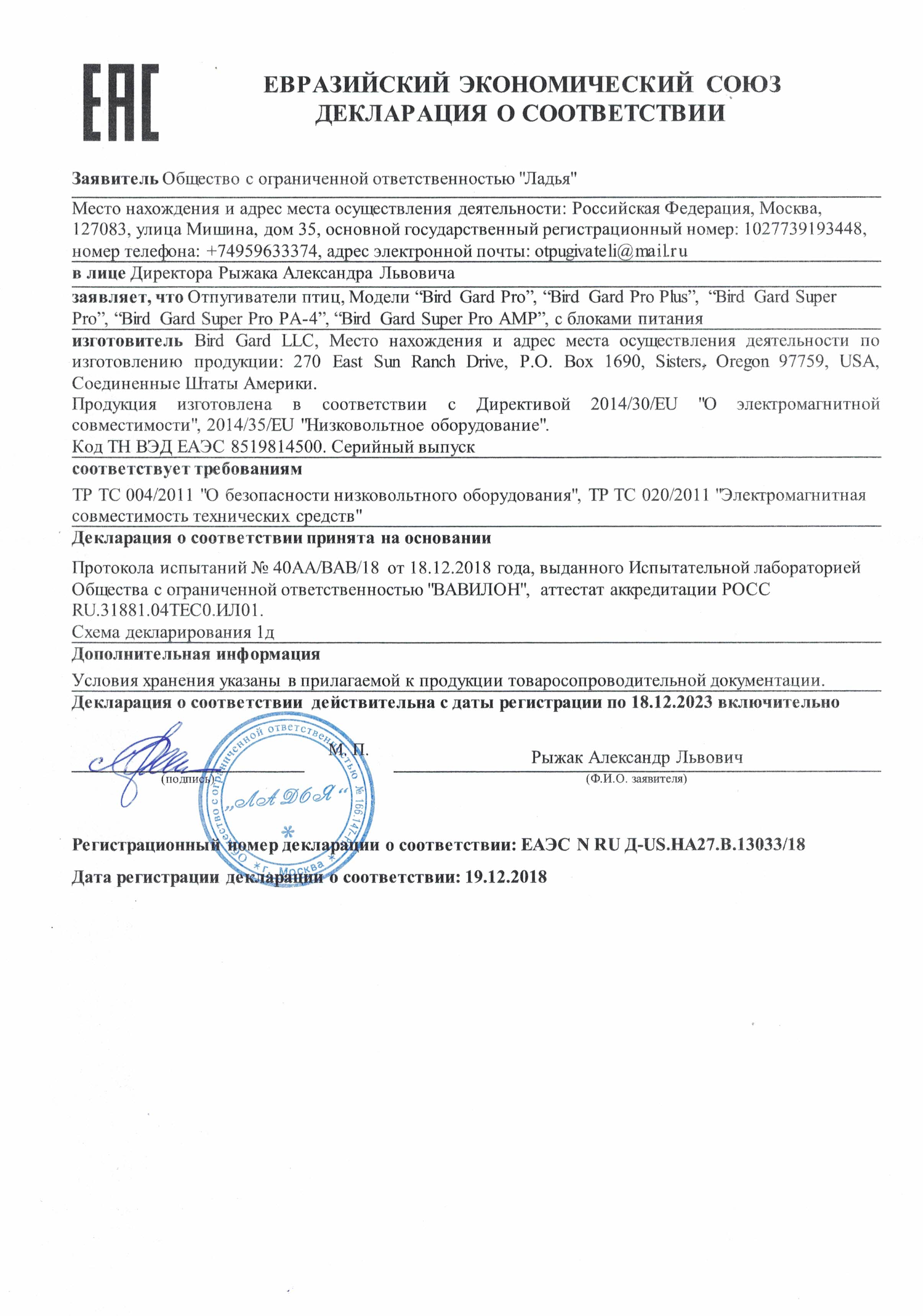 - компания ООО "Ладья" - эксклюзивный дистрибьютор изготовителя данных отпугивателей (Bird Gard LLC). Это гарантирует, что у нас Вы сможете не только произвести закупку оборудования, но и получить высококвалифицированные рекомендации по поводу особенностей применения отпугивателя и защиты от птиц. Вы можете быть уверены, что купили именно то, что Вам нужно;