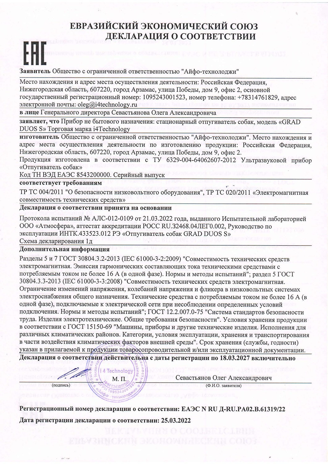 Отпугиватель "Grad Duos S" сконструирован и изготовлен известной российской инновационной фирмой i4Technology (ООО "Айфо-Технолоджи"). Для сборки отпугивателя применяются только качественные комплектующие, а во время производства задействована комплексная система контроля качества с пятиступенчатой проверкой, которая гарантирует полное соответствие характеристик прибора заявленным параметрам.